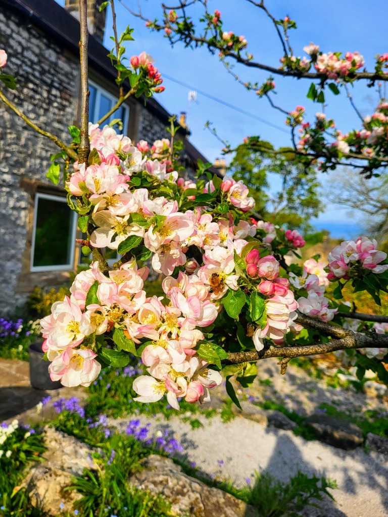 Once spring comes in fully, I am ready for it. One of my springtime rituals is to observe the tree blossom that appears in my garden and local area. First the blackthorn and cherries come through, and then pears and apples. I like to go under my apple trees and look closely at the flowers, smell their lovely scent and think about the promise of fruit that will come. I like to watch the bees on the trees, going from flower to flower, no doubt happy to have something to collect from after a long winter, in turn providing an essential link toward the autumn apples forming. We have one crab apple tree that you can hear the buzzing long before you reach the tree itself. This small piece of mindfulness gives me my springtime hope and reminds me of the natural annual cycles that my body still responds to.
